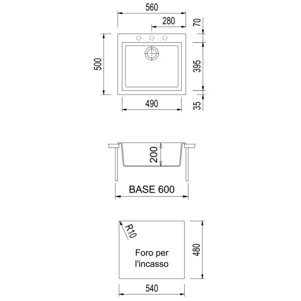 560×505 mm - Fregadero de una cubeta, con agujeros preperforados para la instalación de la griferíaone y accesorios.